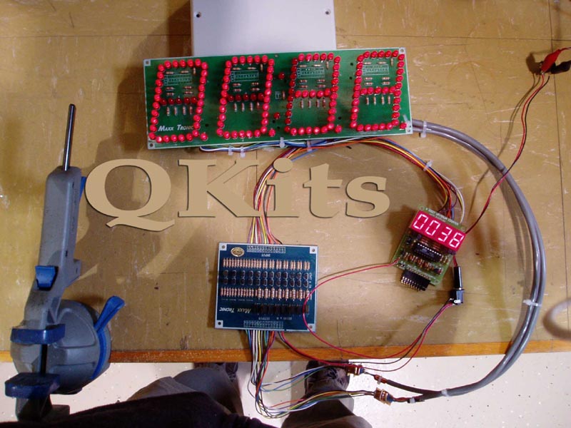 The MXA008 is shown connected to the QK129 4 digit counter. Not included with the MXA008 and also shown with the MXA039 4 digit display (not included).